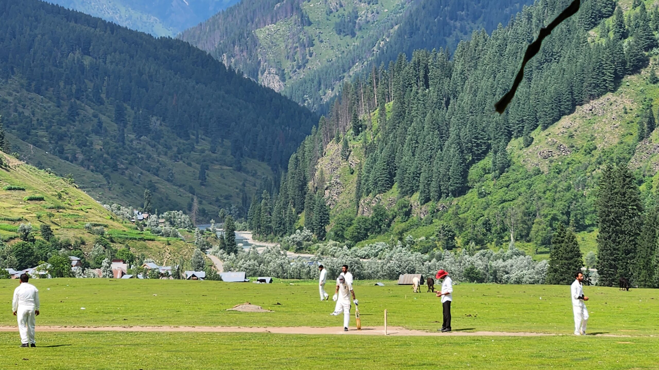 Bowling continued only from the Village End, as it had gentle slope adding character to the pitch. The edge of the boundary at the bowlers end flirted with charming village houses. Twice, the cricket ball was lost in the hedges of these house due to batsman powerful strike. Cows, unfazed by the spectacle, meandered onto the field intermittently, evoking laughter as fielders took turns shooing them away.